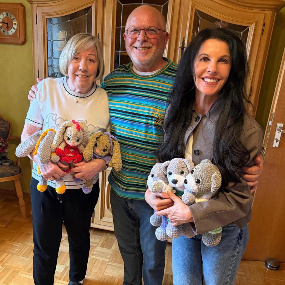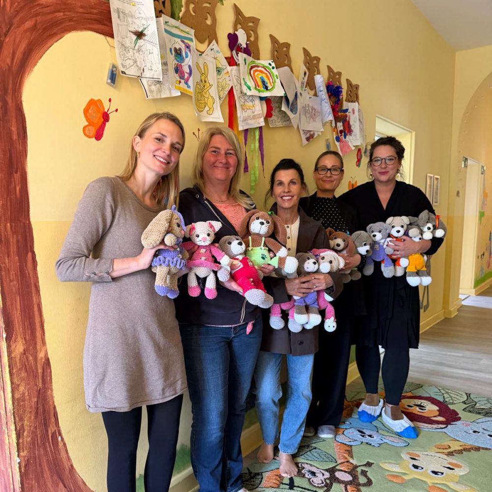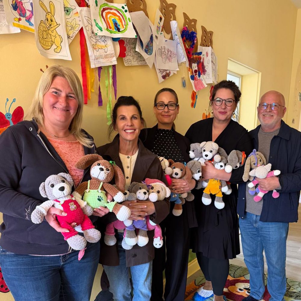 Anlass war die Übergabe von rund 40 handgefertigten, gehäkelten Teddys. Durch Zufall ist Sandra Simchen, bei einem Besuch bei Ihrer Tante Ingrid Bayer darauf aufmerksam geworden, dass Ingrid nach Ihrer Pensionierung diese wunderschönen Einzelstücke für Kleinkinder häkelt.